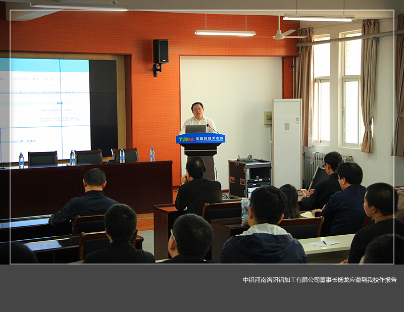 10月11日下午,中铝河南洛阳铝加工有限公司党委书记、董事长、总经理杨龙应邀到我们作了题为《科技是中国铝加工业发展的不竭动力》的学术报告。材料学院师生200多人聆听了报告。 杨董事长首先介绍了中铝河南洛阳铝加工有限公司的概况,并从河南及洛阳铝加工行业现状、我国铝加工行业发展历程、中铝集团发展沿革等三个方面阐述了铝加工行业的发展脉络。杨董事长的报告创新性和实用性明显,广大师生受益匪浅。