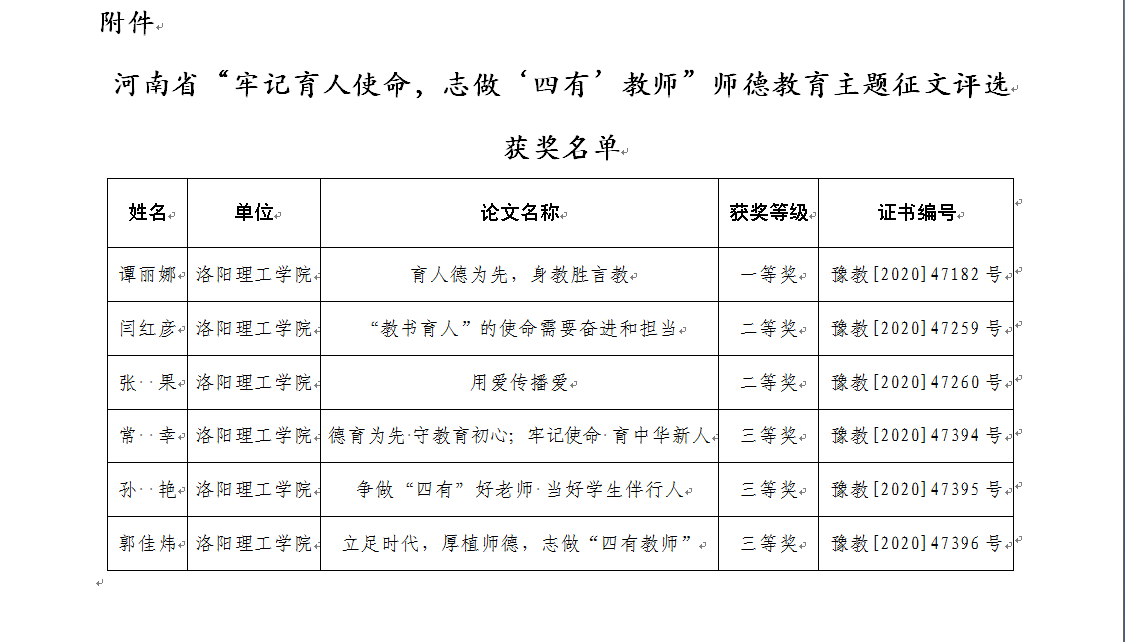 我们闫红彦老师获得省级“牢记育人使命 志做‘四有’教师”师德教育主题征文评选二等奖