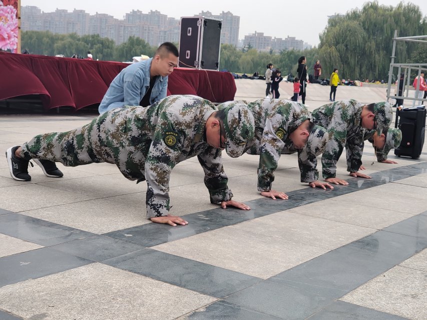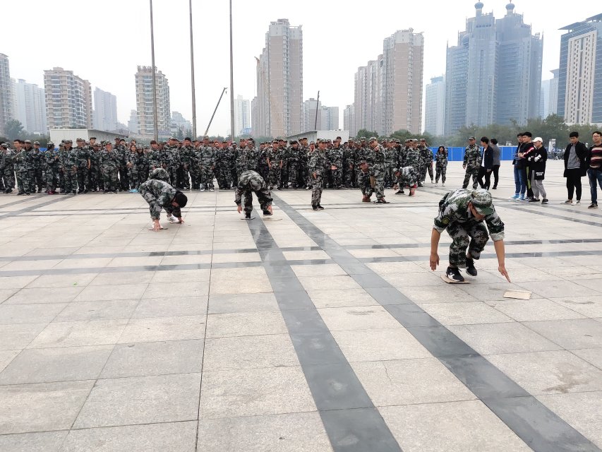 周六早上六点四十,同学们准时到达九九广场,清点人数后徒步到达体育场,简单的整理之后开始了最后的训练。 “一个都不能少”,大家抱成团站在报纸上,即使会输,也没有一个队选择放弃,大家紧紧抱着队友坚持到最后。“拯救队长”时,每个小队选出一个男队长和一个女队长,各组队员围成一个小圈进行站军姿,一个人动,队长受罚,每次受罚数目加倍,男队长俯卧撑,女队长蹲起。训练到最后,队长筋疲力尽,却还是笑着面对自己的队员,队员们只能眼睁睁的看着队长们接受惩罚。游戏结束后,大家都冲上去抱着各自的队长,为他们按摩,帮助队长放松。