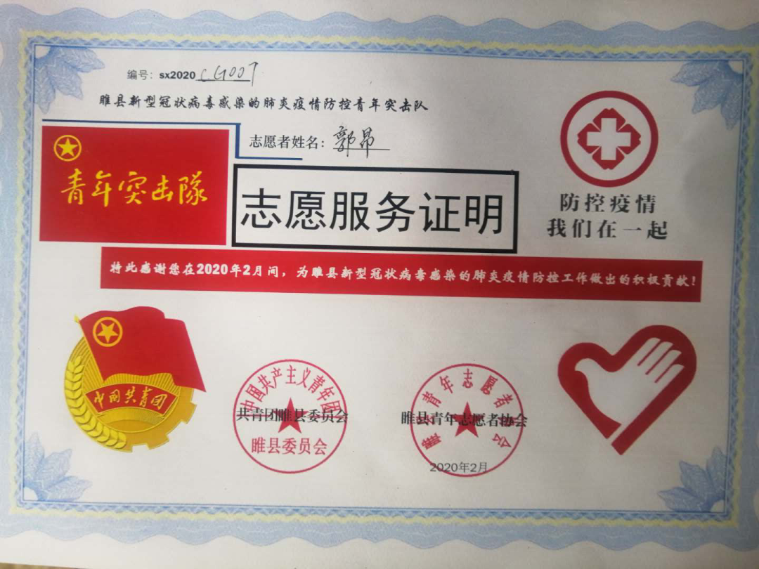 为了坚决打赢疫情防控攻坚战,该生积极响应中国共青团的号召,自愿加入“青年志愿者疫情防控突击队”,奉献自己的力量。以爱为纽带,抗击疫情,防疫战线,也是中国爱的战线!