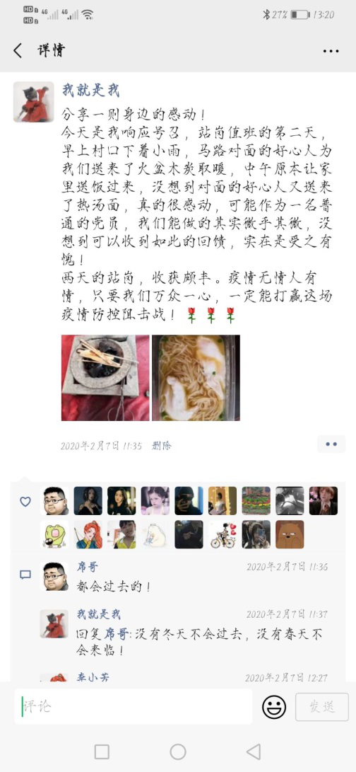 在这次志愿服务的过程中,她被仅比自己大三四岁却已是党员的表哥表姐所折服,他们身为党员的自我奉献、甘于付出的超高觉悟让她肃然起敬,也基于此,她很骄傲自己能在他们的影响下加入抗疫小组,履行自己身为一名共青团员的义务,为村民以及国家奉献自己的一份微薄之力!