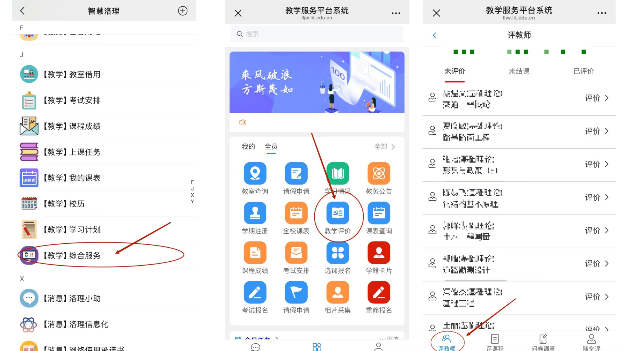 2.手机端进入“智慧洛理→综合服务→教学评价→点击本学期课程进行评价”。如下图: