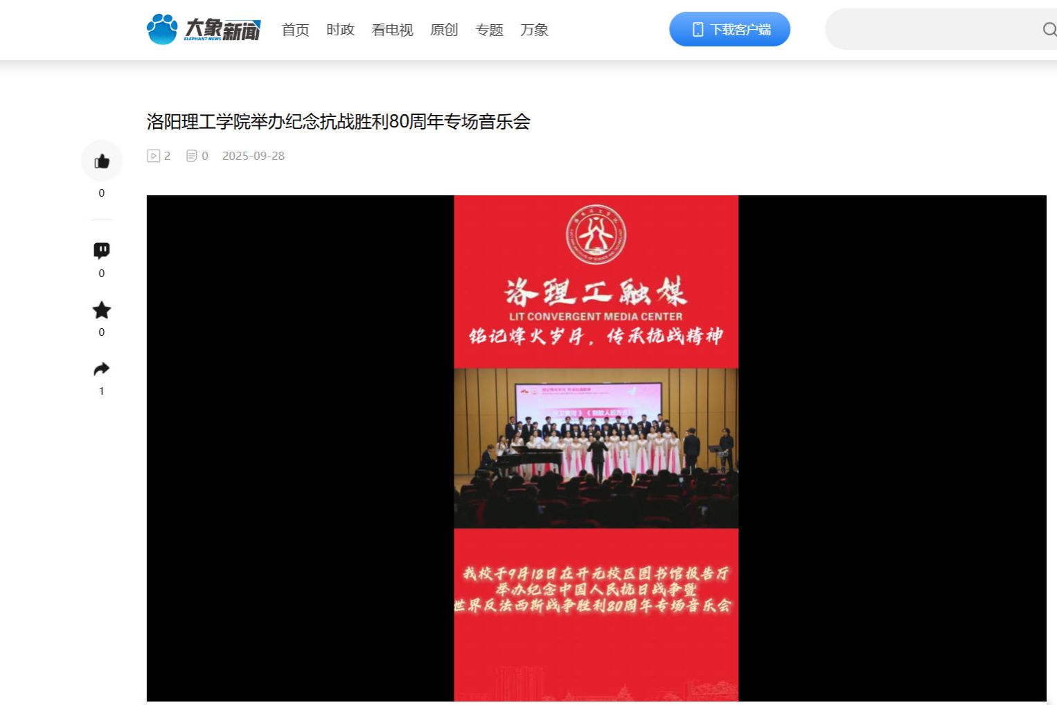 9月28日,大象新闻客户端、顶端新闻客户端分别以短视频形式报道我们举办纪念中国人民抗日战争暨世界反法西斯战争胜利80周年专场音乐会。