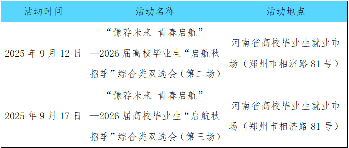 “豫荐未来 青春启航” 2026 届河南省高校毕业生“启航秋招季”综合类双选会
