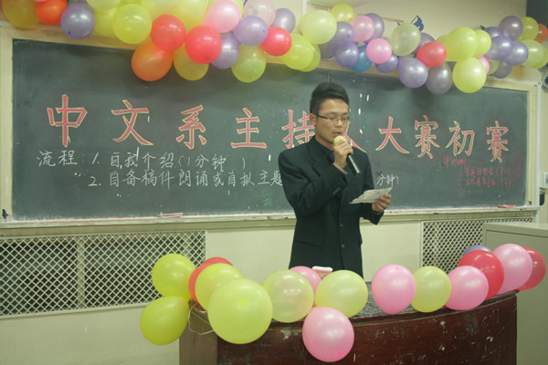 10月18日晚,由中文系学生会文艺部主办的以“梦与想”为主题的主持人大赛初赛在A418教室举行。院主持团张帅、尚青青、院广播站徐竹怡、第四届系主持人大赛第一名闫明明、第五届系主持人大赛第一名范明泽以及第二名王聪担任评委。