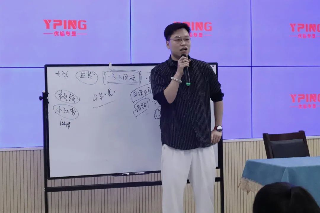 接着,河南圣炬创客文化发展有限公司代表王少驰上台演讲。他先对公司大致情况作了介绍,河南圣炬创客文化发展有限公司属于线上销售型公司,主要运营模式是线上网络营销。随后他通过提出两个问题:“你有什么技能是别人不会的?”、“有哪些事情你会有自信比别人做得好?”来强调要重视自身的独特性。