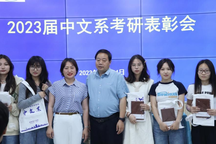 最后,我们院长扈耕田、副院长张丽娜及中文系教师给2023届考取研究生的同学颁发奖品和纪念品,并合影留念。