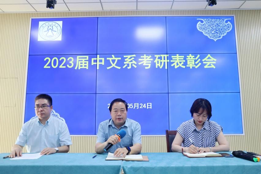 为表彰优秀考研学子,激发学生的考研积极性和主动性,彰显优良的教风学风和人才培养质量,引导学生树立正确考研目标,我们中文系于2023年5月24日17点,在BE301室举行“2023届中文系考研表彰会”。我们院长扈耕田教授、副院长张丽娜、中文系全体老师、2023届考取研究生同学及低年级学生代表参会。会议由中文系系主任赵棚鸽主持。