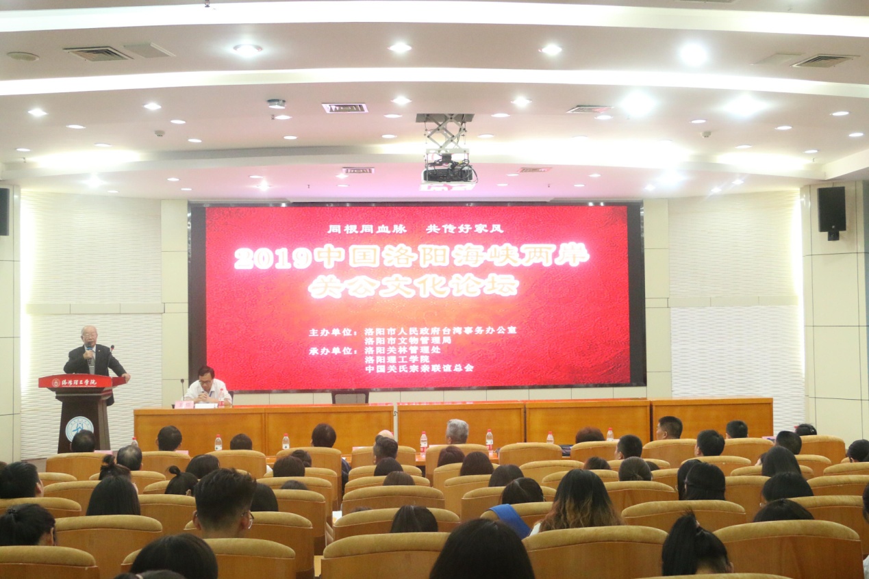 9月27日下午,“2019中国洛阳海峡两岸关公文化论坛”在我们王城校区办公楼二楼报告厅隆重举行。论坛由洛阳市人民政府台湾事务办公室、洛阳市文物管理局主办,洛阳关林管理处、伟德betvlctor体育官网、中华关氏宗亲联谊总会承办。洛阳市人民政府台湾事务办公室副主任顾雪林、台湾关氏宗亲会会长关先辉、中国民间文艺家协会关公文化专业委员会主任胡泊、中华关氏宗亲联谊总会会长关群声、洛阳关林管理处处长周海涛,以及海峡两岸学者和我们师生80余人参加了此次研讨会。
