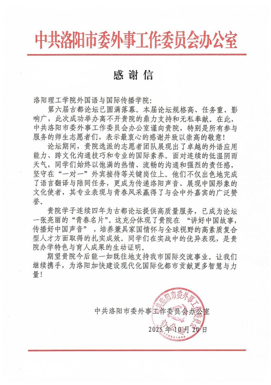 2025年10月20日,中共洛阳市委外事工作委员会办公室向我们发来感谢信,就我们学生在第六届古都论坛中的卓越志愿服务表现表示高度赞赏与衷心感谢。这封官方信函,标志着我们志愿服务工作再次获得市级层面的高度认可,成为彰显学院育人成效的又一力证。